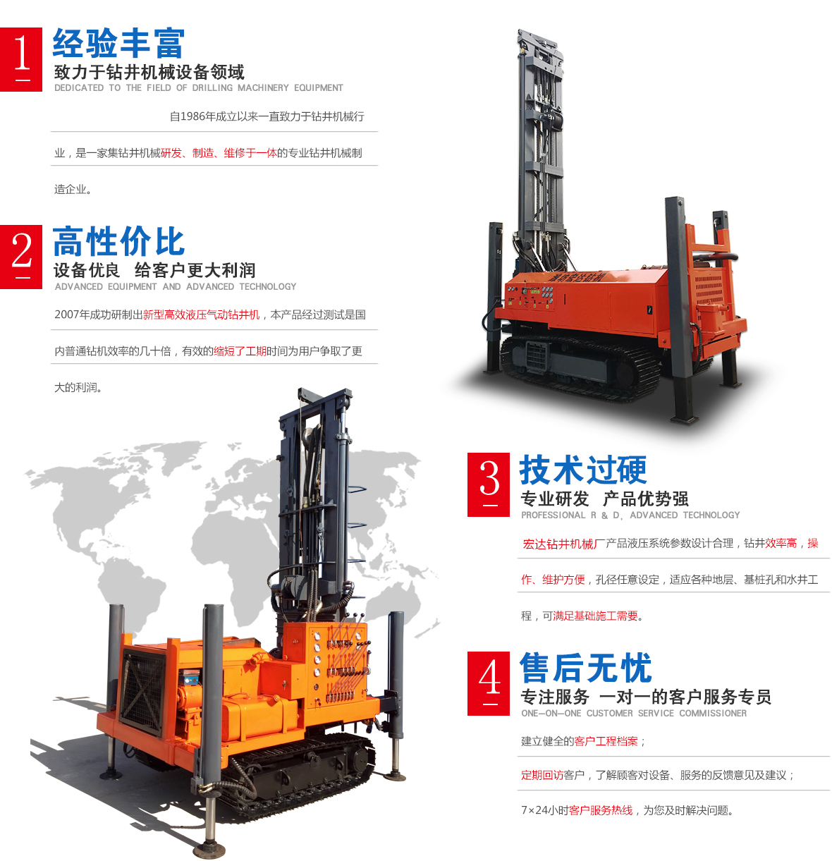 本公司生產(chǎn)各種類(lèi)型鉆井機(jī)械,經(jīng)過(guò)本公司的不懈努力終于在2007年成功研制出新型高效液壓氣動(dòng)鉆井機(jī),本產(chǎn)品經(jīng)過(guò)測(cè)試是國(guó)內(nèi)普通鉆機(jī)效率的幾十倍,有效的縮短了工期時(shí)間為用戶(hù)爭(zhēng)取了更大的利潤(rùn),該產(chǎn)品液壓系統(tǒng)參數(shù)設(shè)計(jì)合理鉆井效率高操作維護(hù)方便,孔徑任意設(shè)定,適應(yīng)各種地層,基樁孔和水井工程,可滿(mǎn)足基礎(chǔ)施工需要。
